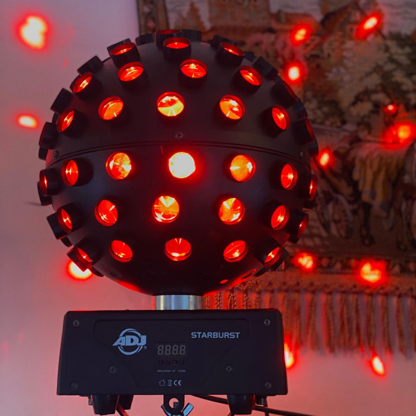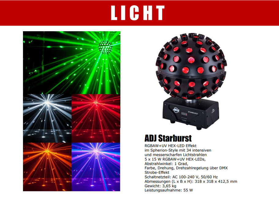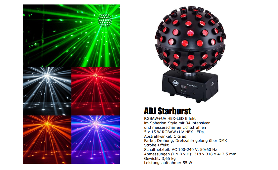 Durch die vielen, weit streuenden LED-Strahlen entsteht ein moderner, dynamischer Sternenhimmel, der jede Tanzfläche in Szene setzt und den Raum mit bewegten Lichtpunkten füllt.