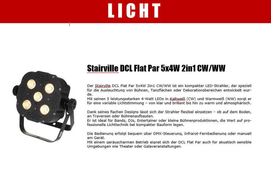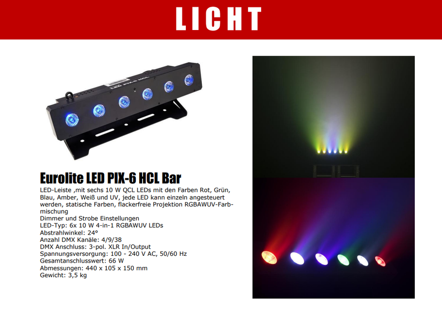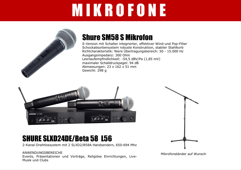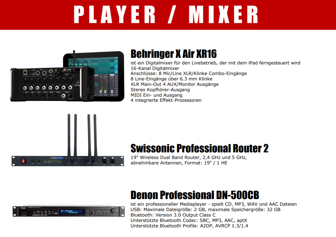 Von Ton- und Lichttechnik bis zu Mikrofonen und Spezialeffekten – alles ist auf professionelle Veranstaltungstechnik ausgelegt.