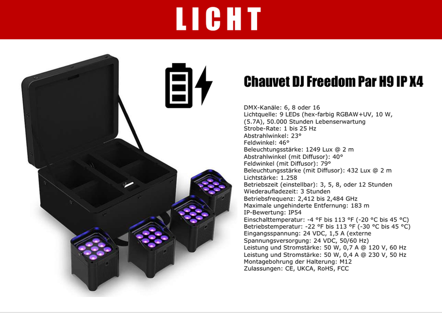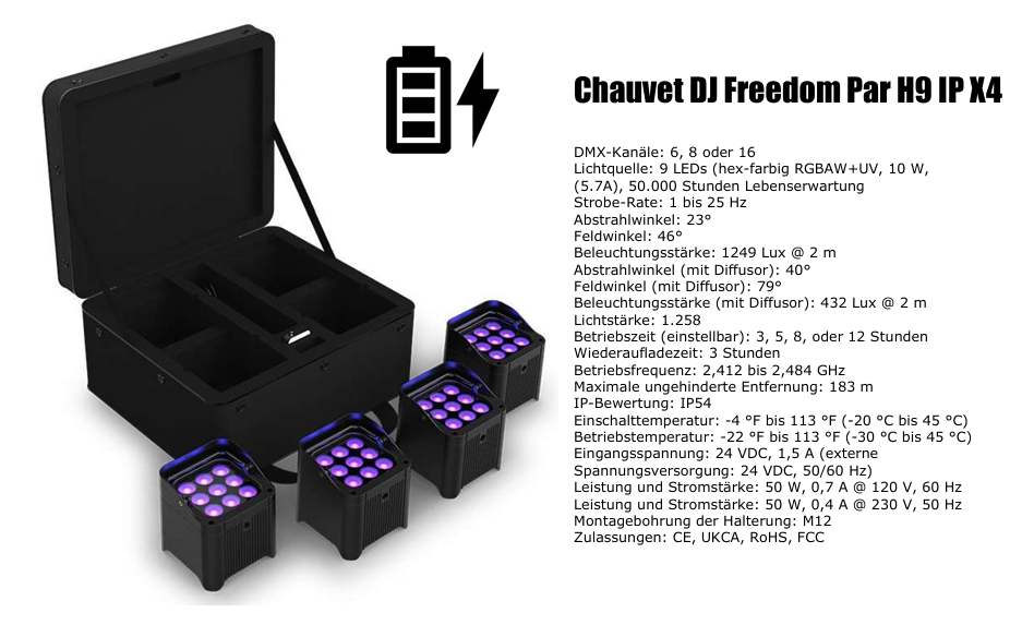 Vier leistungsstarke, akkubetriebene LED-Scheinwerfer tauchen deine Location in warmes oder farbiges Licht – ideal, um Highlights zu setzen und Räume elegant in Szene zu setzen.