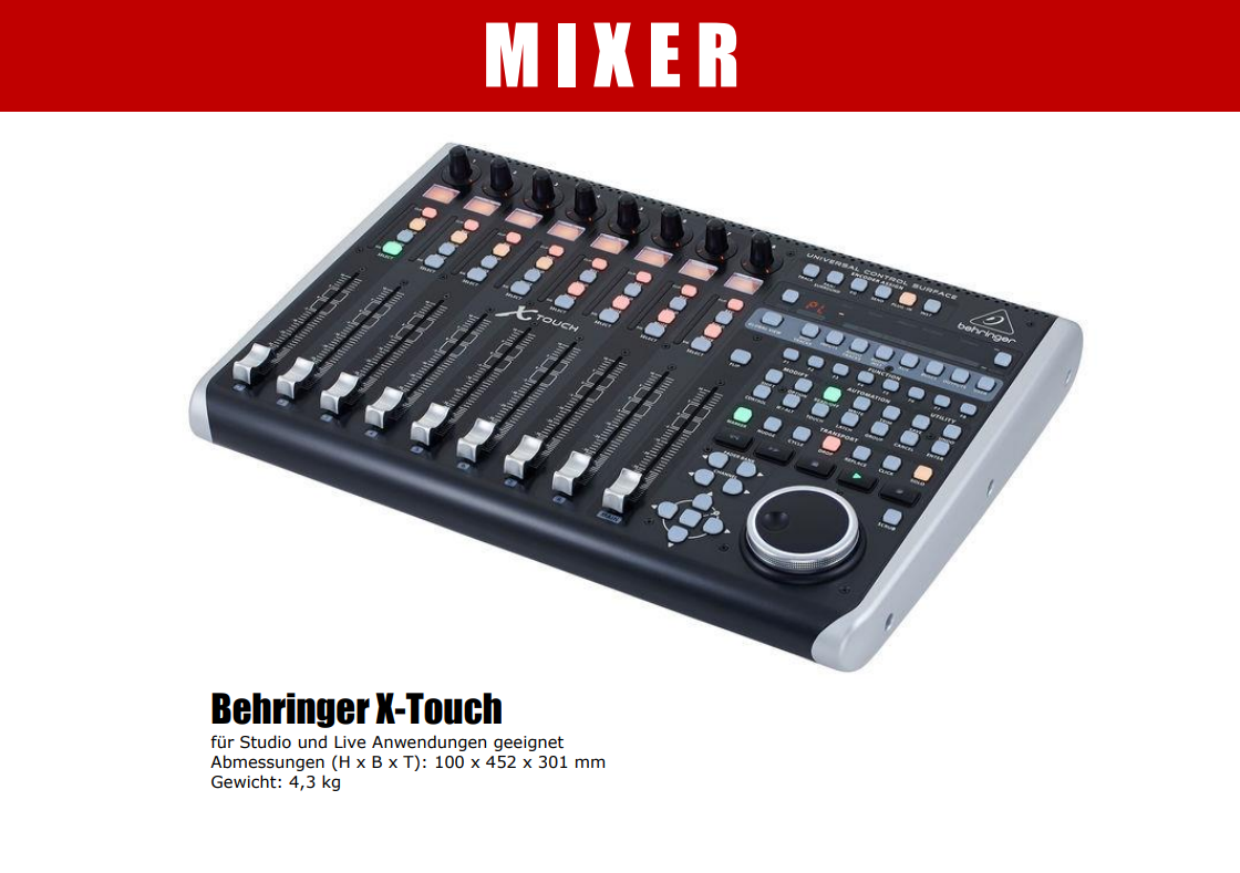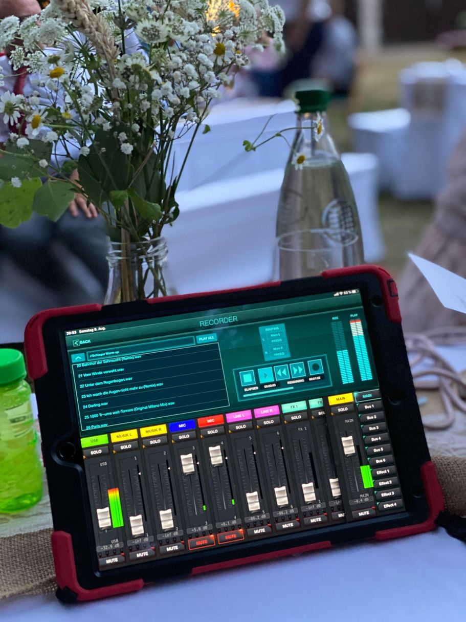 Und wenn mal eine Band mitspielt, kommt mein Behringer X-Air mit X-Touch zum Einsatz.