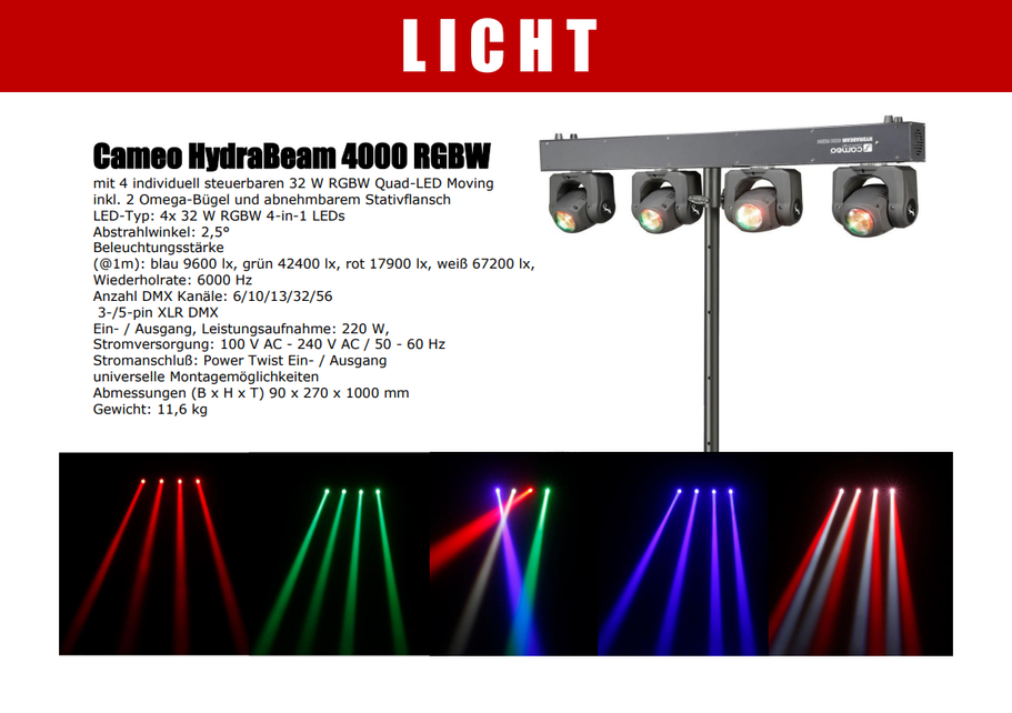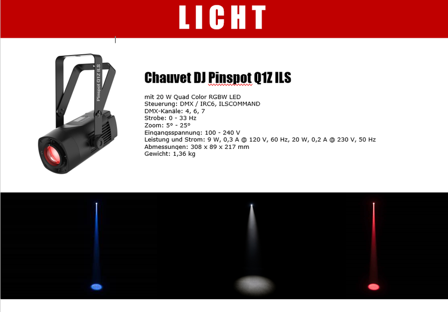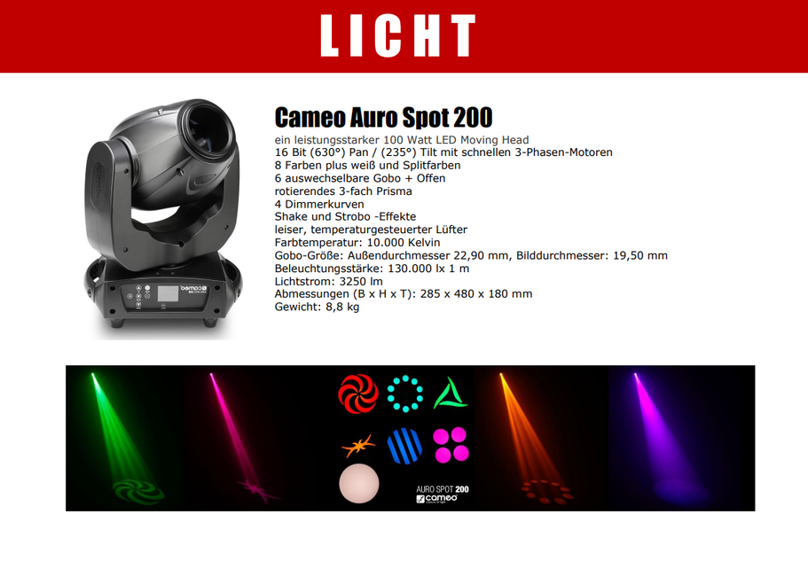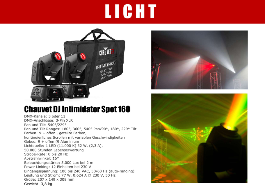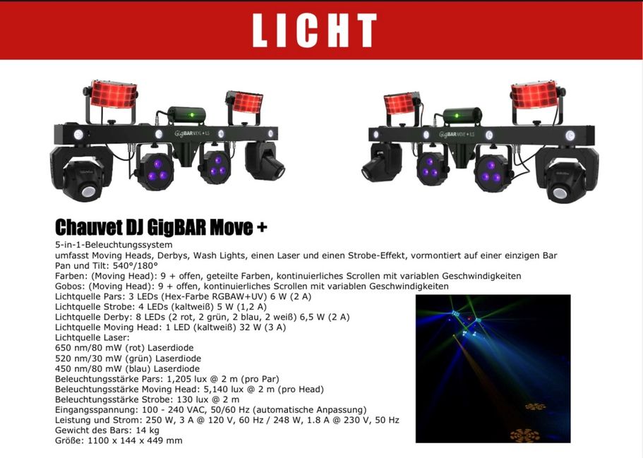 Zum Einsatz kommen hochwertige Systeme von Cameo, Eurolite, Chauvet DJ und ADJ – für ein stimmungsvolles Lichtdesign, das perfekt auf jedes Event abgestimmt ist.