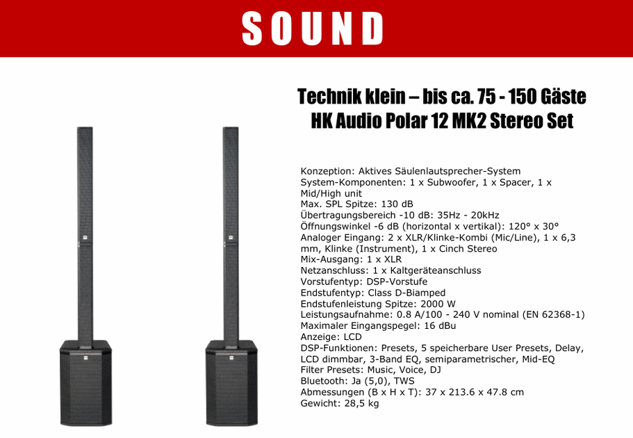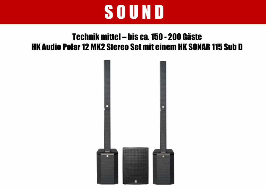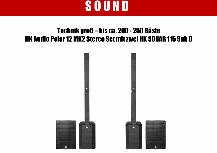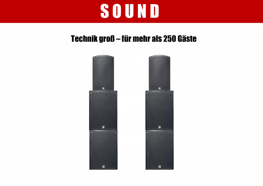 Ob kleine Feier oder großes Event – die Technik wird individuell an Location und Gästezahl angepasst und sorgt für klaren, kraftvollen Klang.