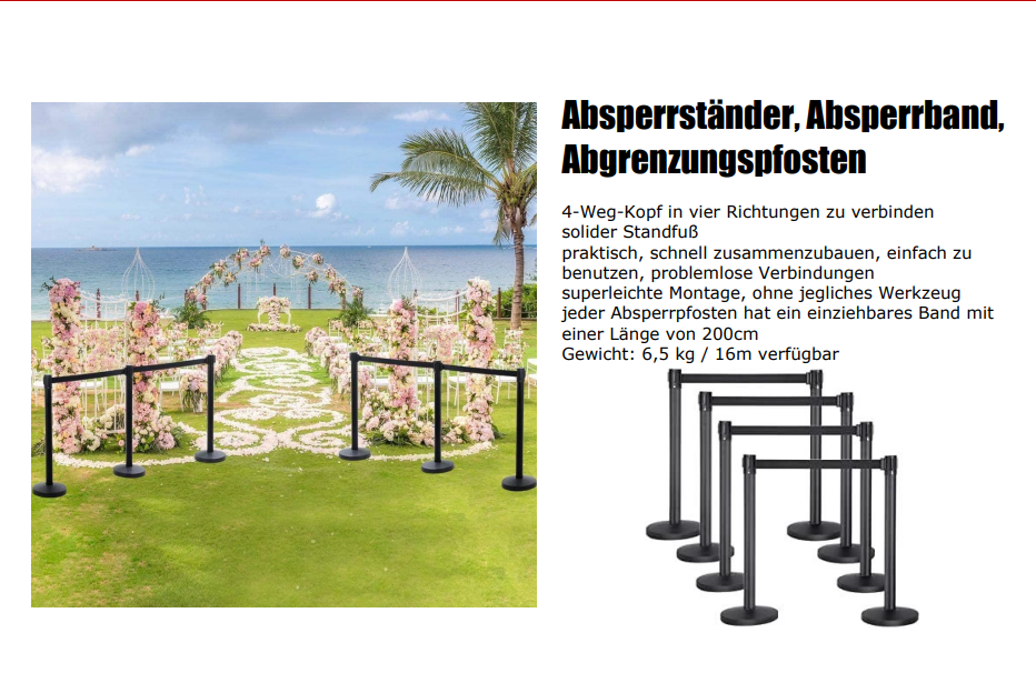 Ideal für Hochzeiten, Firmenevents und jede Veranstaltung, bei der klare Wege und elegante Abgrenzungen wichtig sind.