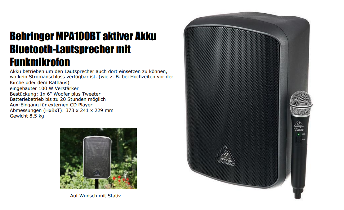 Dank des integrierten Funkmikrofons eignet es sich außerdem hervorragend für Ansprachen, Begrüßungen oder Programmpunkte – klar verständlich und ohne Verkabelung.